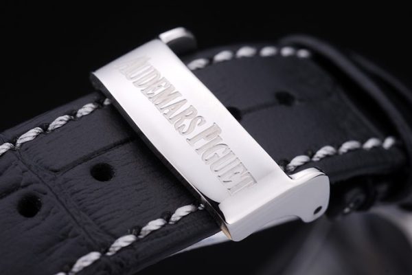 Back: Stainless steel screwed down back with a mechanics revealing transparent center and Royal Oak engraving Gender: Men Movement: Kinetic (Automatic) Quality: Japanese Miyota Color: Nero Case: Brushed Stainless Steel Case Bracelet: Black crocodile leather strap with white thread stitching and heat embossed Audemars Piguet name and logo and an Audemars Piguet inscribed stainless steel flip-over hook clasp Bracelet Length: 240 x 25 mm Bezel: Crystal studded polished stainless steel screwed down bezel Band Type: coccodrillo Diameter Skin: 47 x 39 mm Watch Clasp: flip Clasp Glass: Sapphire Crystal Crown: Stainless steel cutwork crown with Audemars Piguet logo Case Thickness: 11 mm