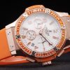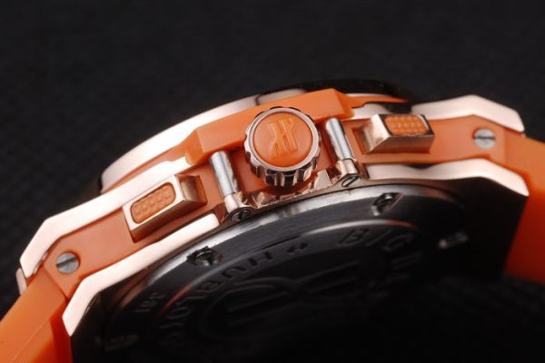 Back: Stainless steel screwed down back with Hublot inscriptions Gender: Women Movement: Quartz (Battery) Quality: Japanese Miyota Color: Arancione Case: Polished 18k rose gold-plated stainless steel case Bracelet: Textured orange rubber band with rose-gold push-button hook clasp and Hublot engravings Bracelet length: 160 x 21 mm Bezel: Orange crystal studded brushed 18k rose-gold screwed down bezel Band Type: Gomma Diameter: 42 x 36 mm Chronograph: Si Watch Clasp: Flip Clasp Glass: Sapphire Crystal Crown: Cutwork rose-gold crown with ‘H’ engraving and two rectangular push-button crowns on either side, all studded with orange rubber trimmings Case Thickness: 13 mm
