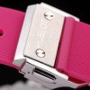 Bracelet: Textured pink rubber band with polished stainless steel push-button hook clasp and Hublot engravings