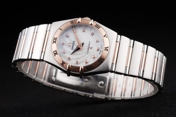 Back: Brushed stainless steel push-in back with engravings Gender: Women Movement: Quartz (Battery) Quality Switzerland ETA Case: Brushed stainless steel case Bracelet: Brushed stainless steel and rose-gold chain link bracelet with hidden clasp and Omega logo on top Bracelet Length: 160 x 16 mm Bezel: Rose-gold bezel with black Roman number hour markers Band Type: Steel inossidabile Diameter: 26 x 25 mm Watch Clasp: Flip Clasp Glass: Sapphire Crystal Crown: 18k rose-gold cutwork crown with Omega logo Case Thickness: 8 mm