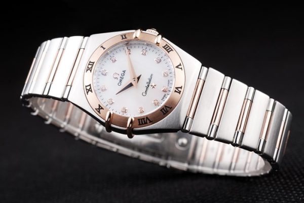 Back: Brushed stainless steel push-in back with engravings Gender: Women Movement: Quartz (Battery) Quality Switzerland ETA Case: Brushed stainless steel case Bracelet: Brushed stainless steel and rose-gold chain link bracelet with hidden clasp and Omega logo on top Bracelet Length: 160 x 16 mm Bezel: Rose-gold bezel with black Roman number hour markers Band Type: Steel inossidabile Diameter: 26 x 25 mm Watch Clasp: Flip Clasp Glass: Sapphire Crystal Crown: 18k rose-gold cutwork crown with Omega logo Case Thickness: 8 mm