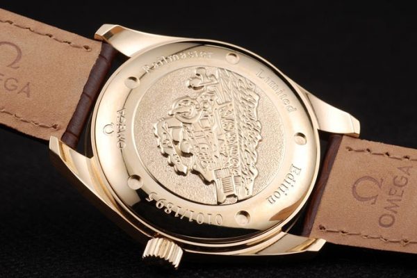 Back: 18k yellow gold plated push-in back with logo and Limited Edition engraving Gender: Men Movement: Kinetic (Automatic) Quality Switzerland ETA Color: Marrone Case: 18k yellow gold case Bracelet: Brown crocodile leather strap with heat embossed Omega stamp and Omega inscribed 18k yellow gold fold-in clasp Bracelet Length: 195 x 20 mm Bezel: 18k yellow gold bezel Band Type: Pelle Diameter: 46 x 38 mm Watch Clasp: Flip Clasp Glass: Sapphire Crystal Crown: 18k yellow gold cutwork crown with Omega logo