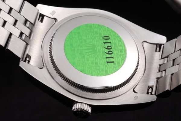 Back: Stainless steel push-in case back with green Rolex logo stamp