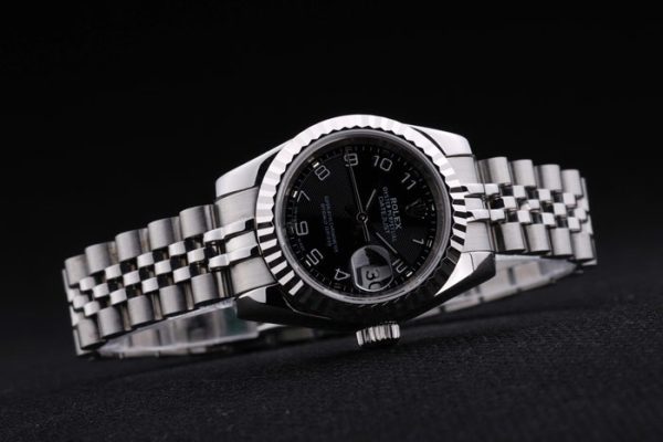 Back: Stainless steel push-in case back with green Rolex logo stamp