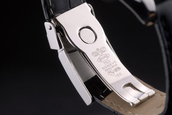 Bracelet: Rolex heat embossed black crocodile leather strap with engraved stainless steel deployment clasp with Rolex logo on top