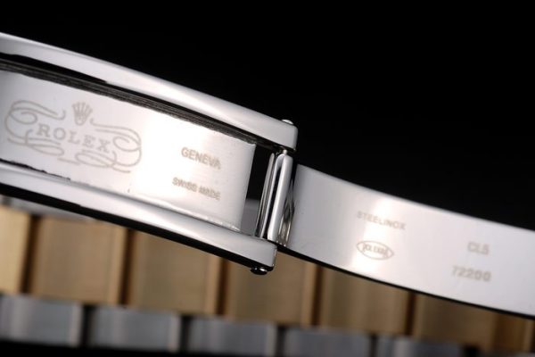 Bracelet: Yellow gold plated and brushed stainless steel link bracelet with engraved deployment clasp with Rolex logo on top